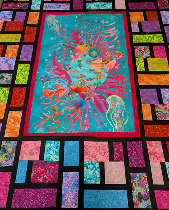 Above is an example of a Memory quilt for a child who loved the ocean. They can be any theme that the family wants. They can also be for adults or pets. There are so many hurting hearts in the Hill Country. Please pass the message on that these Memory quilts are free to the hurting families. The design, right now, is a stained glass pattern with a center panel. It is about 53" x 66". The center panel can be a picture of a loved one, a pet, or themed.